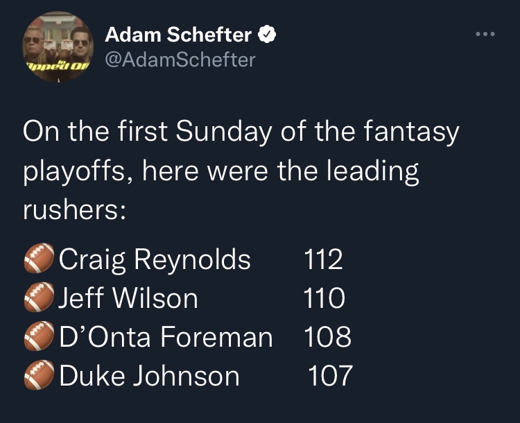 In all seriousness, this was about the worst fucking playoff matchup I’ve ever seen…until the MNF doubleheader began. I mean, don’t get me wrong, this whole matchup still sucked, but holy shit, I’ve never seen a crazier finish in all my days of FF. Redman’s team was done for the week, sitting at a lowly 72 points, and Ted was roughly 18 points behind…but had two of the hottest WRs in the league going on Monday — Hunter Renfrow and Justin Jefferson. Done deal, amiright?!