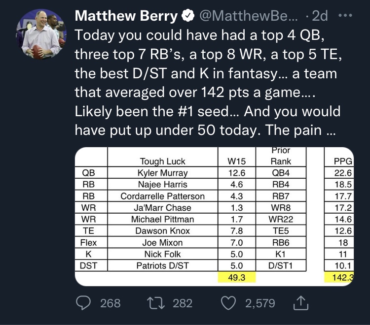 Thank God and Sonny Jesus I had a bye this week in Terrible Ten and had been eliminated from contention in my other leagues, because I can’t imagine how stressful it was to watch those games and *need* points from key players, only to be skunked. If you’ve been online the past few days, it’s hard to escape the memes: