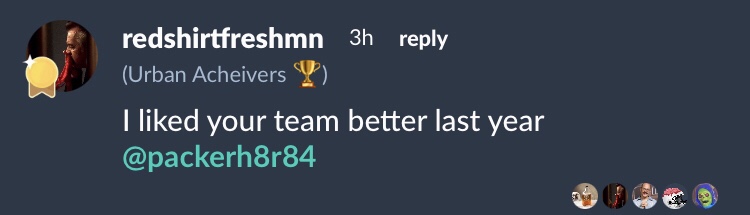 And last, when our season wrapped up in 2021 no one would have guessed that Week One’s best matchup would involve Packer Hater. Alex’s team was abysmal last year, much worse than his record alluded to. But after an offseason that yielded Josh Allen, Leonard Fournette, Cooper Kupp, Mike Williams, and a slew of rookies, Alex looked poised to move from worst to first. He was well on his way after TNF, when Allen and Kupp gave him a huge lead. As much as he didn’t want to admit it, his opponent — last year’s champ, Urban Achievers — was nervous: