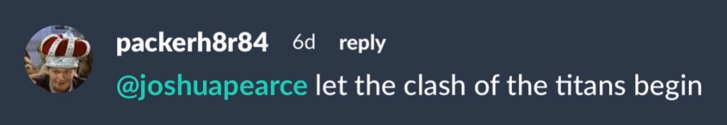 Kind of fun to see Packer Hater get mouthy and bring the fight to his opponent. The only problem? You gotta back up the shit talk, something Alex wasn’t able to do despite the relatively high point total for the week. In the end, Puff’s Punishers machine-gunned the Hater, 134.90 – 109.28, keeping himself in first place and building upon his already massive Points For total. For now, Josh is definitely the king of the hill, and it’s looking like we might be screwed.