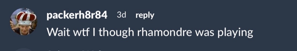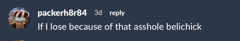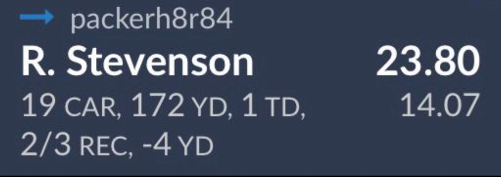 Ok, this time I’m done. Sorry to drag that out, but our other matchup, Packer Hater vs Buzzystinger, was nowhere near as exciting. Initially it looked like we might have some drama when Bill Belichick activated Rhamondre Stevenson but did not start him, leaving The Hater a little perturbed: