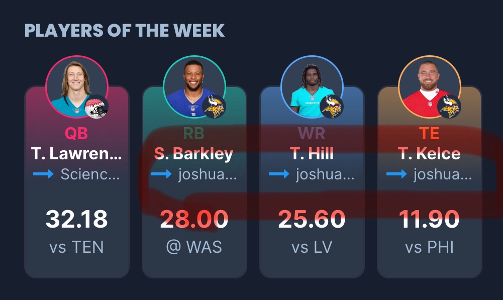 Back to FF, last week’s Thursday plays were kind of brutal. Both Mark Andrews and Joe Burrow were injured early in the TNF game, both of whom now look to be out for the season (although Harbaugh seems to think Andrews might come back). It turned into a tit-for-tat situation for Packer Hater and Urban Achievers after that: Redman lost Achane after one run, Alex lost Walker after a few runs; Redman got only one catch from AJ Brown; Alex lost Kupp early in his matchup. In the end, Urban Achievers won the battle of attrition, 91.74 – 77.94, getting him one step closer to a playoff spot *and* a first-round bye.