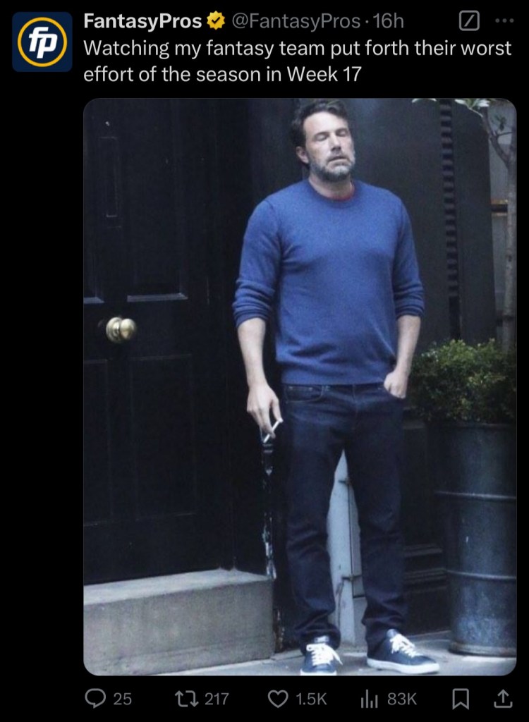 All that whining aside, I have to give credit where credit is due: Redman, per usual, has a helluva team. As if weapons like CMC, Chase, Hall, and AJ Brown aren’t already an embarrassment of riches, Urban Achievers drafted some studs this preseason. While the hype was on Harrison going into the season, it was guys like Nabers and Daniels that became every-week starters, and they both shined in the championship game, scoring almost 65 points between the two of them. Or, in other terms, one of them was worth more than my first six guys!