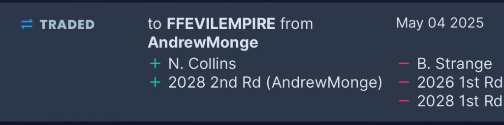 Here’s hoping this proves to be another lopsided trade in the future. Nico surely didn’t live up to his potential this week, scoring a measly 4 points (Yes!), but on my side of the matchup, I started Stroud with his pathetic 8 points (No!), so we both felt the burn. Unfortunately for QB Farm Team, it was a common theme on the day, whereas Evil Empire roll-baby-rolled his way to a 109.64 – 88.90 victory. Congrats, Scotty. Happy to see your star is shining brightly again this season.